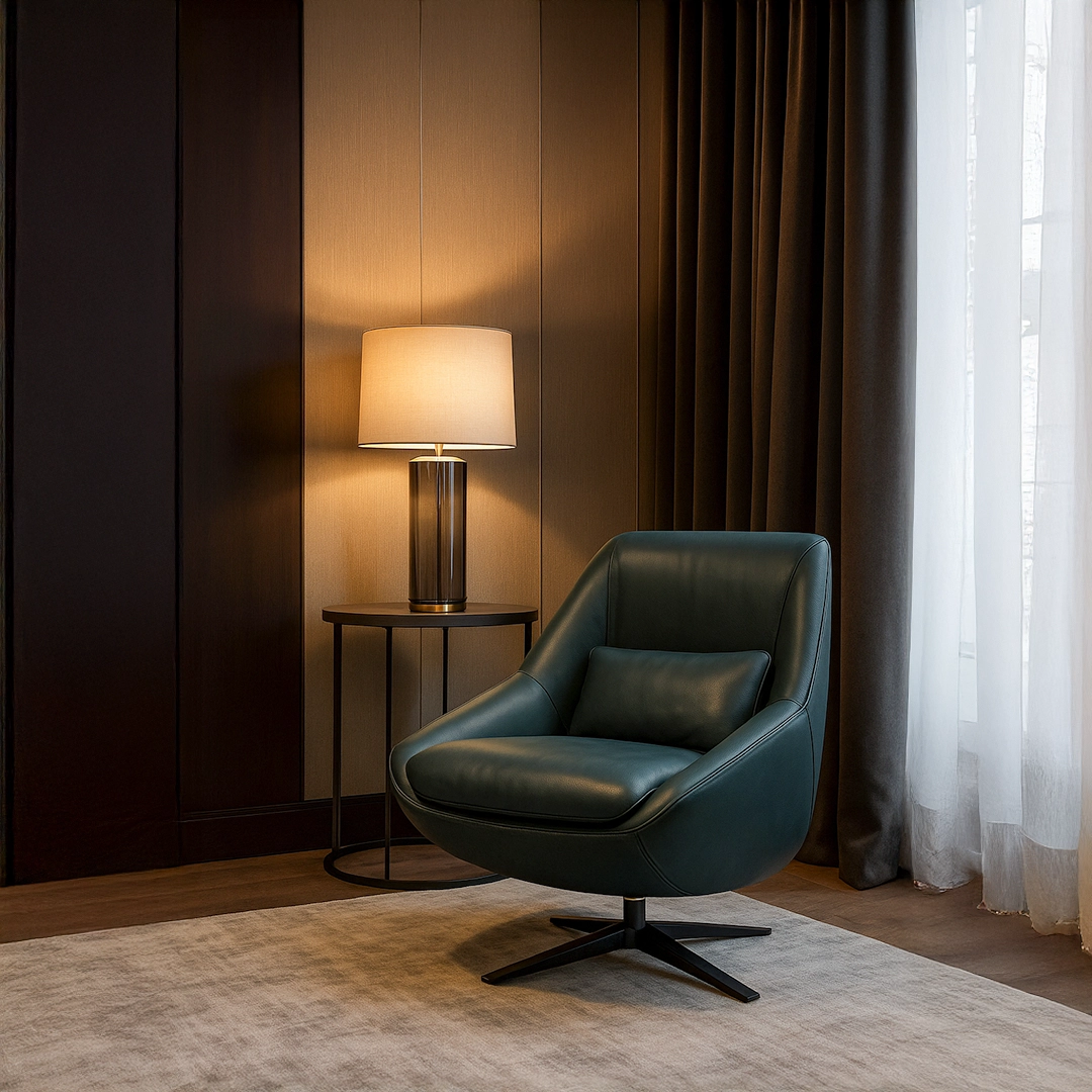 The ALEX chair embodies refined modernity with its sculpted form and enveloping comfort. Designed for versatility, its sleek contours and 360° swivel base create a dynamic balance between relaxation and sophistication.