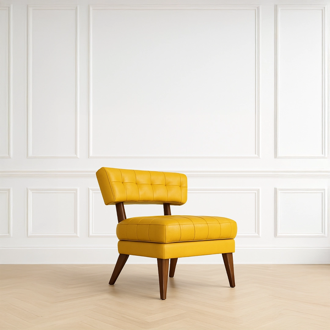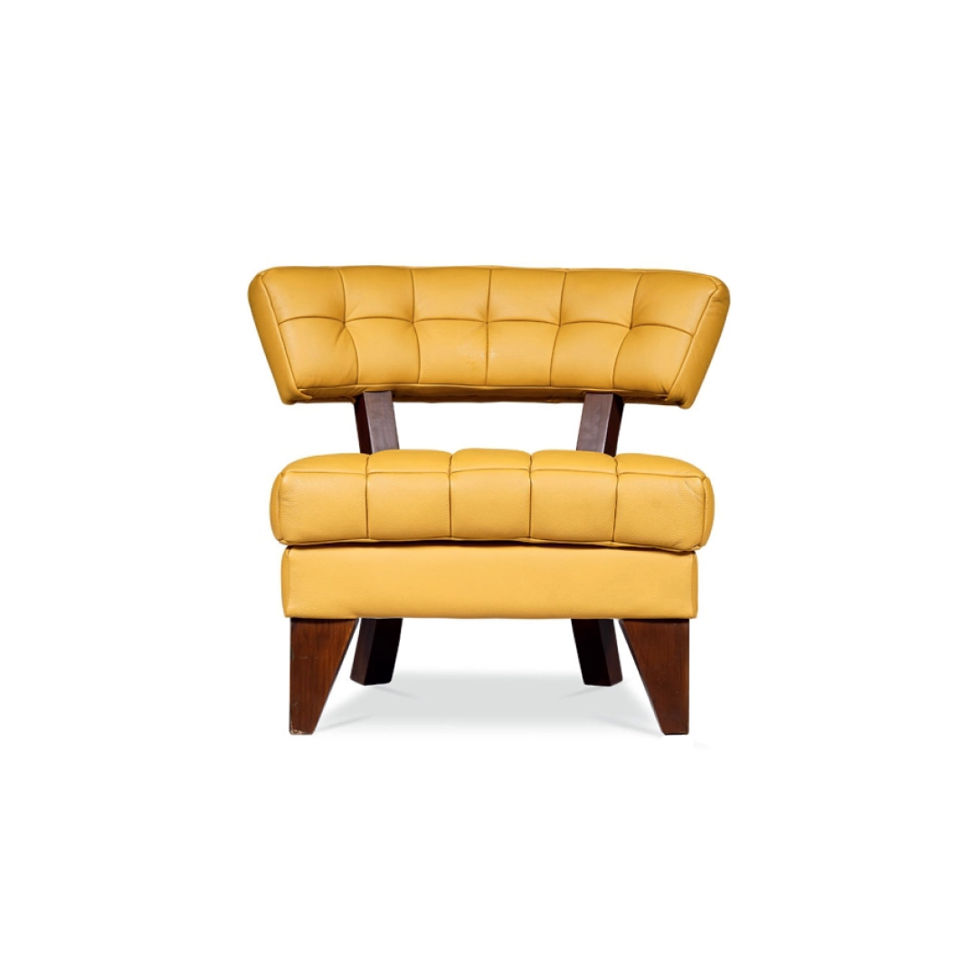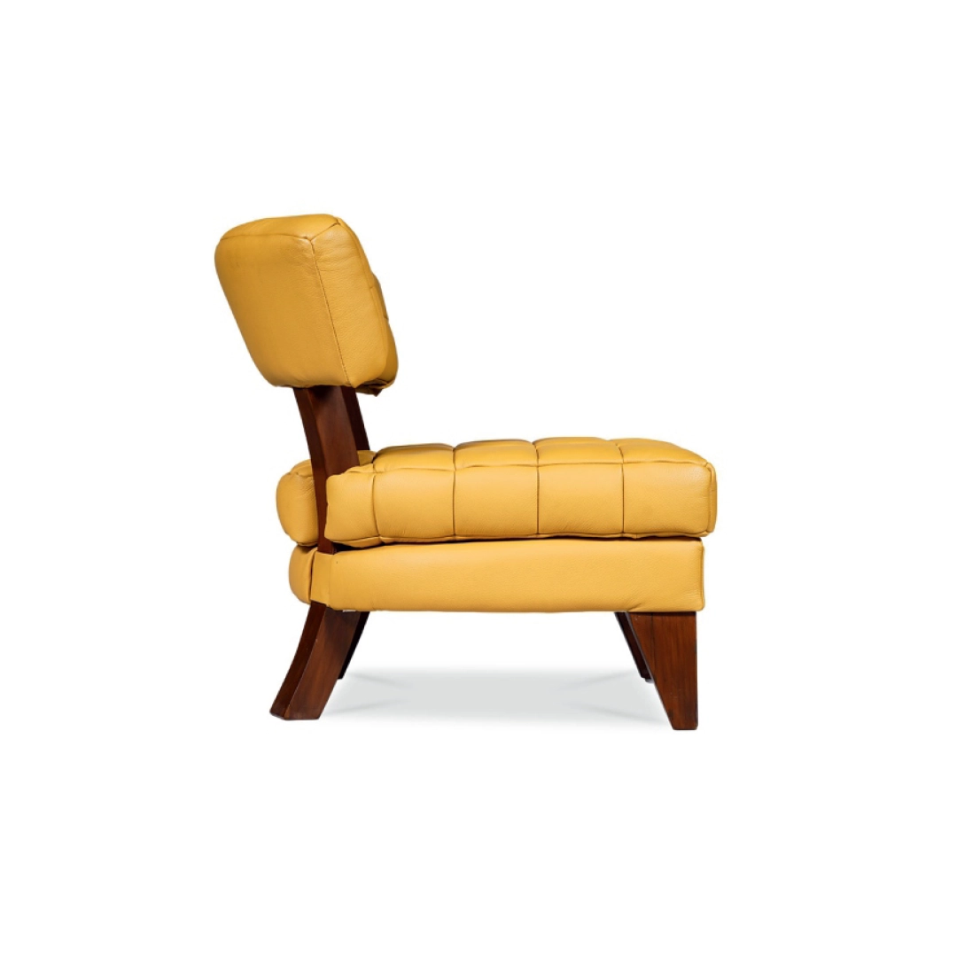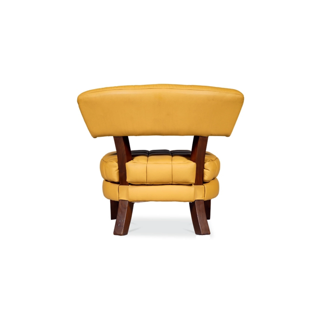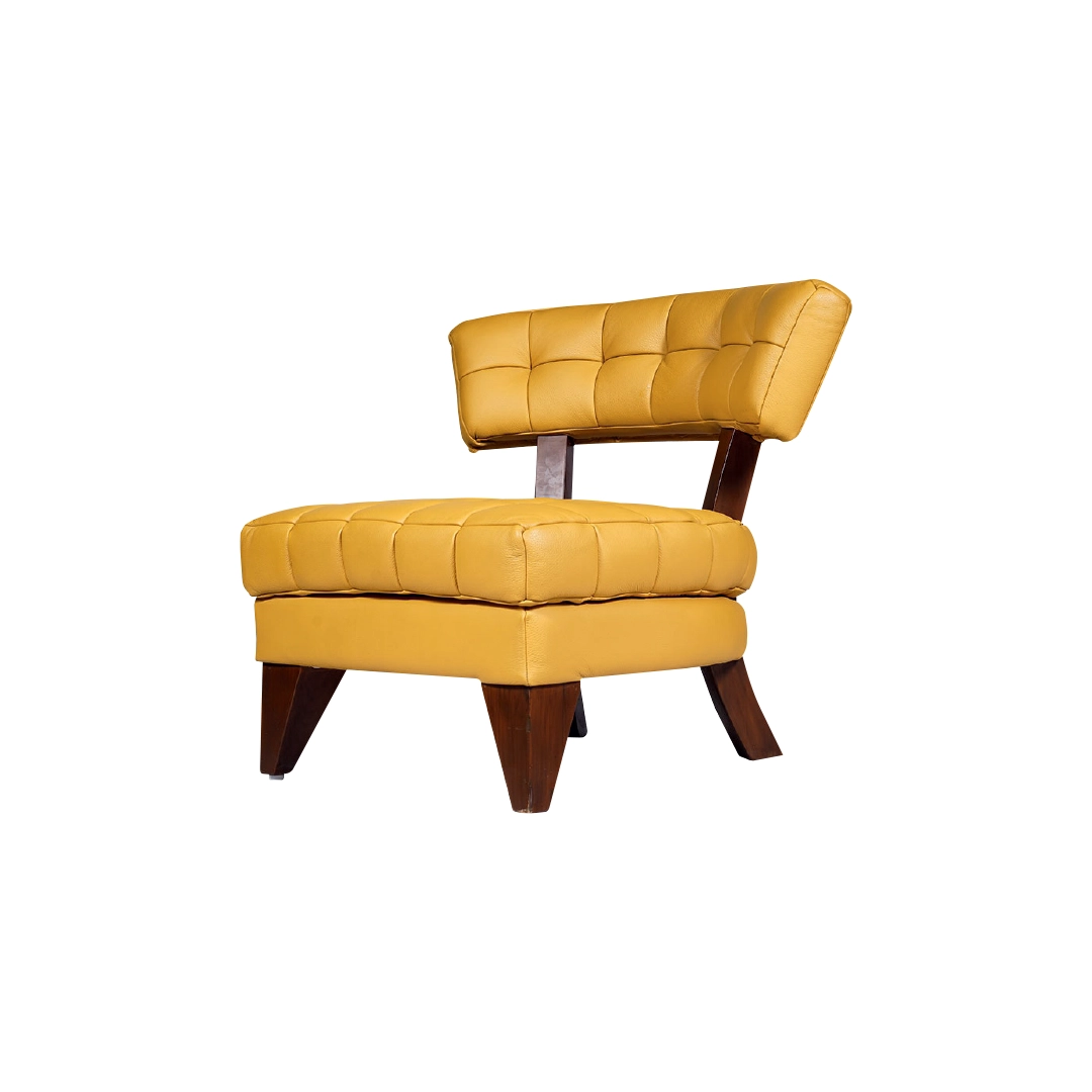 The LUXE lounge chair is an icon of contemporary luxury. Its plush tufted cushions and rich leather upholstery rest atop bold, angular wooden legs—striking a perfect balance between comfort and craftsmanship. The open-back design enhances visual lightness while maintaining generous seating comfort, making it an ideal statement piece for lounges, suites, and upscale living spaces.