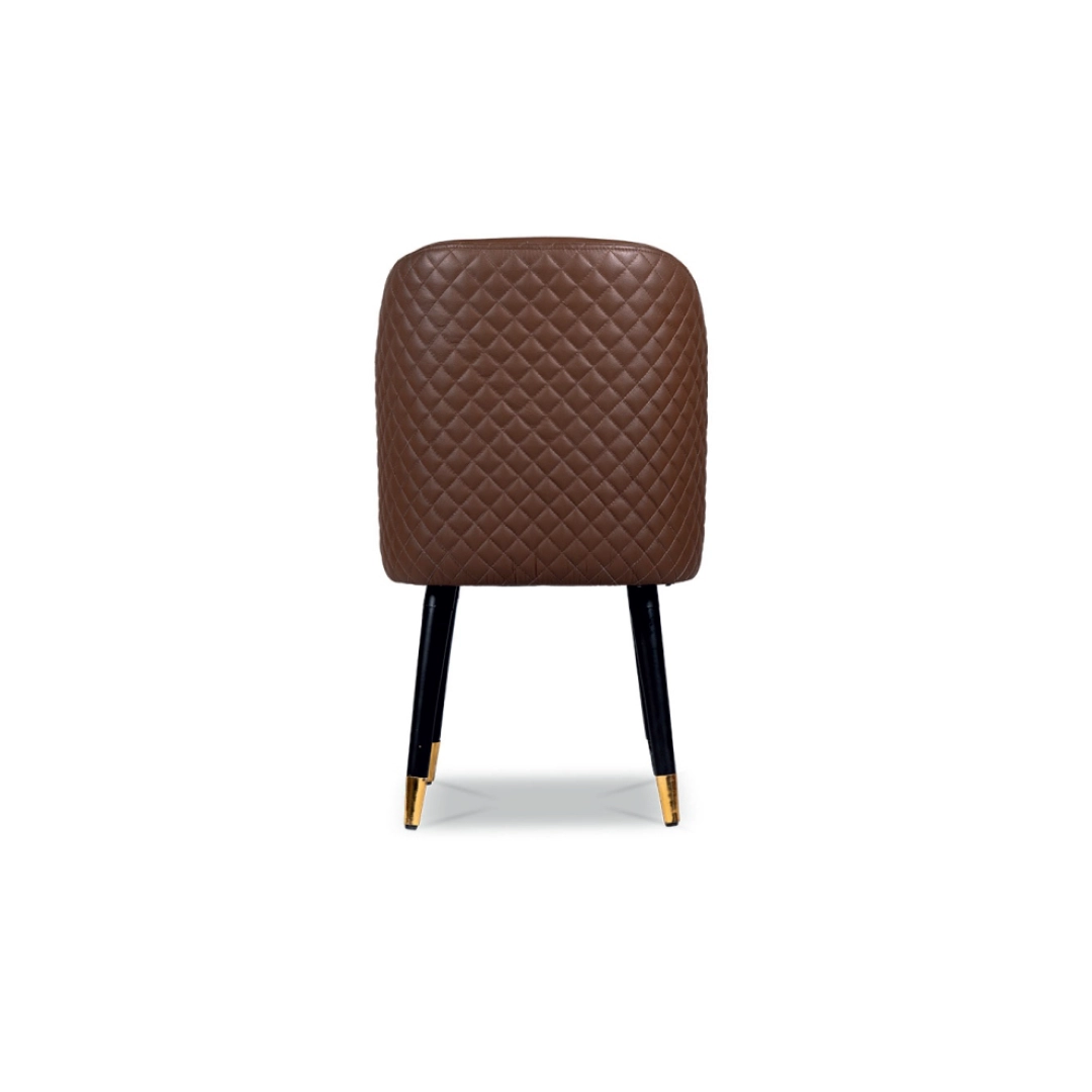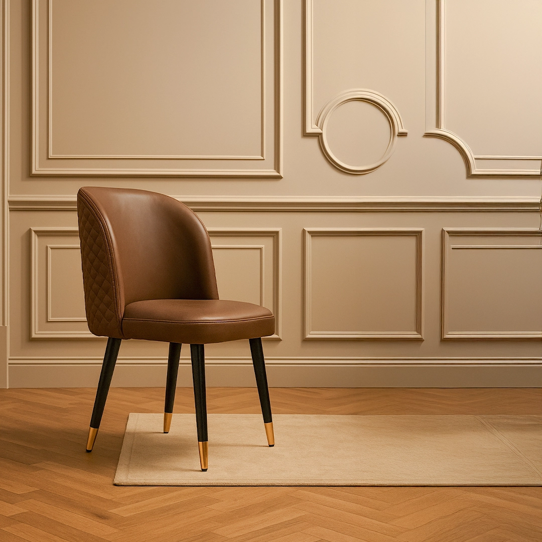The PLUME chair is a modern classic, exuding sophistication through its soft curves and exquisite detailing. Its contoured backrest with intricate quilting merges artistry and comfort, while the leather upholstery enhances its luxurious appeal. Supported by tapered legs with golden accents, PLUME adds a polished charm to contemporary dining or lounge spaces.